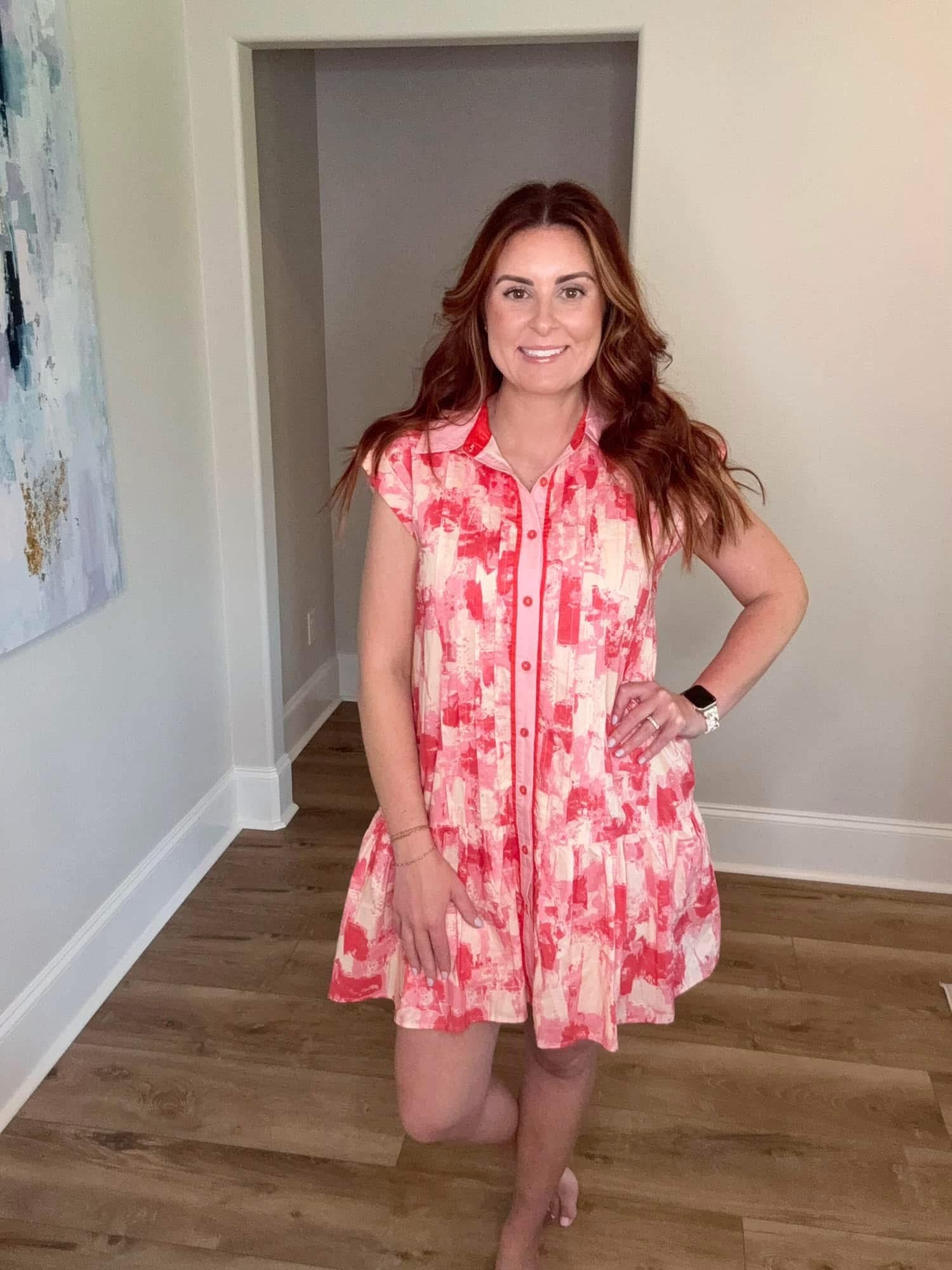 This abstract pink and red dress is the perfect combination of fun and flirty. With its bold colors and playful design, it is sure to make a statement wherever you go. Made with high-quality materials, this dress is not only stylish but also comfortable to wear. Elevate your wardrobe with this must-have piece.