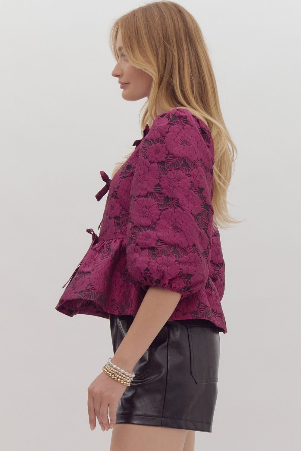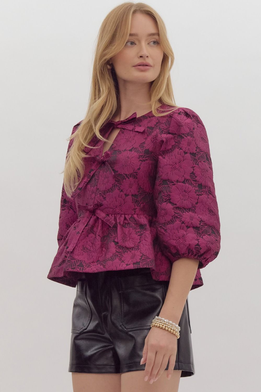 Elevate your style with our Floral Jacquard Puff Sleeve Peplum Top. Made with premium fabric for luxurious comfort, this top features puffed sleeves, a delicate bow detail, and a flattering peplum silhouette. Perfect for all occasions, it adds sophistication to any outfit. Upgrade your wardrobe and feel confident and elegant like our 5'10" model.