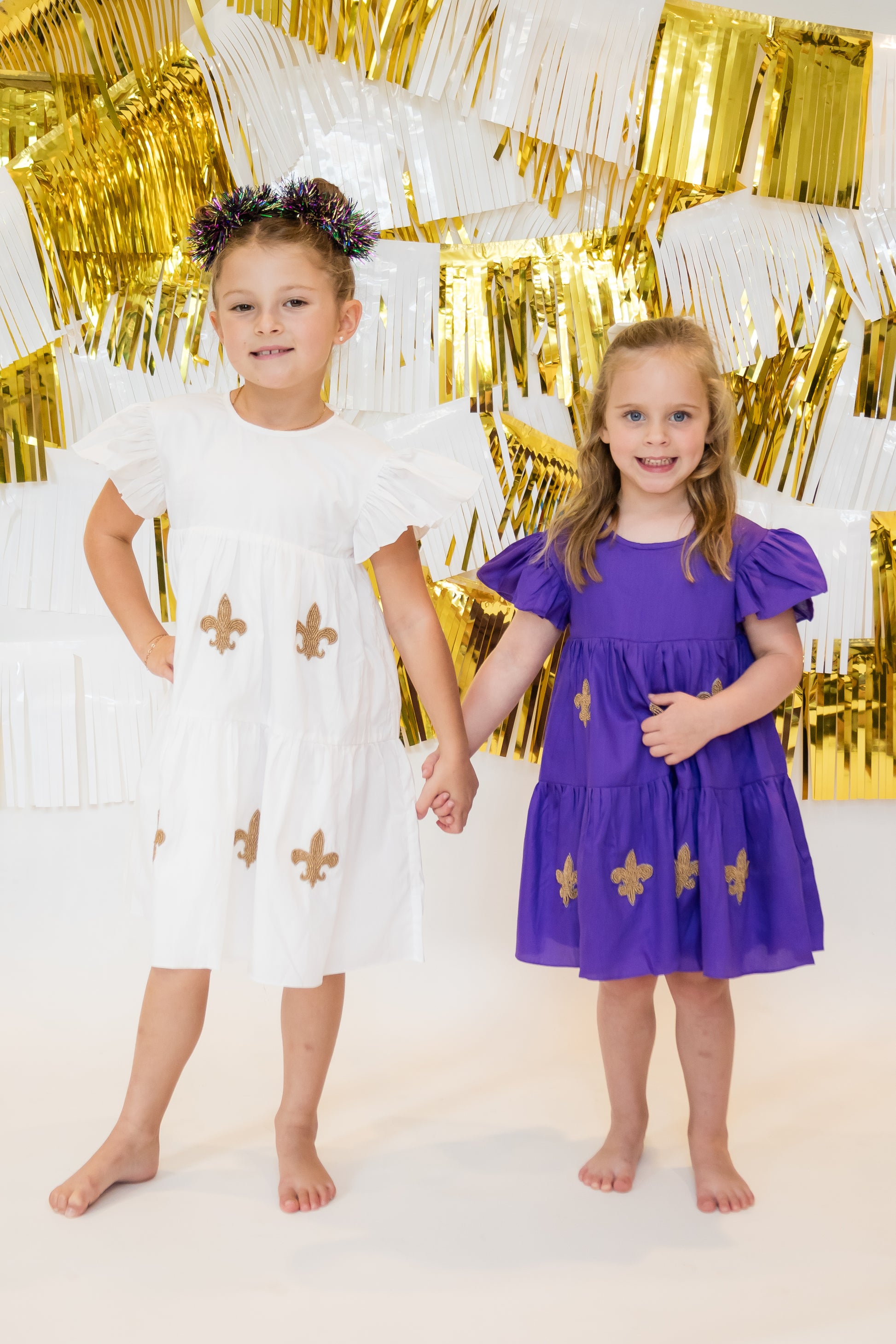 Gear up for the big game with our Game Day Girl Dresses! Available in White, Purple, and Black with a fun gold fleur de lies design, these dresses will make you stand out in the crowd. Perfect for showing off your team spirit while still looking stylish. Get yours now!