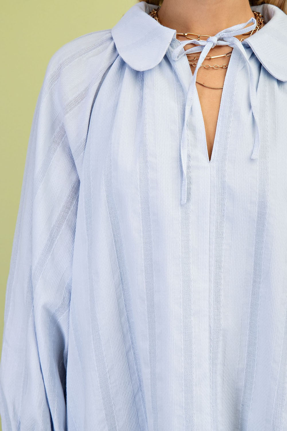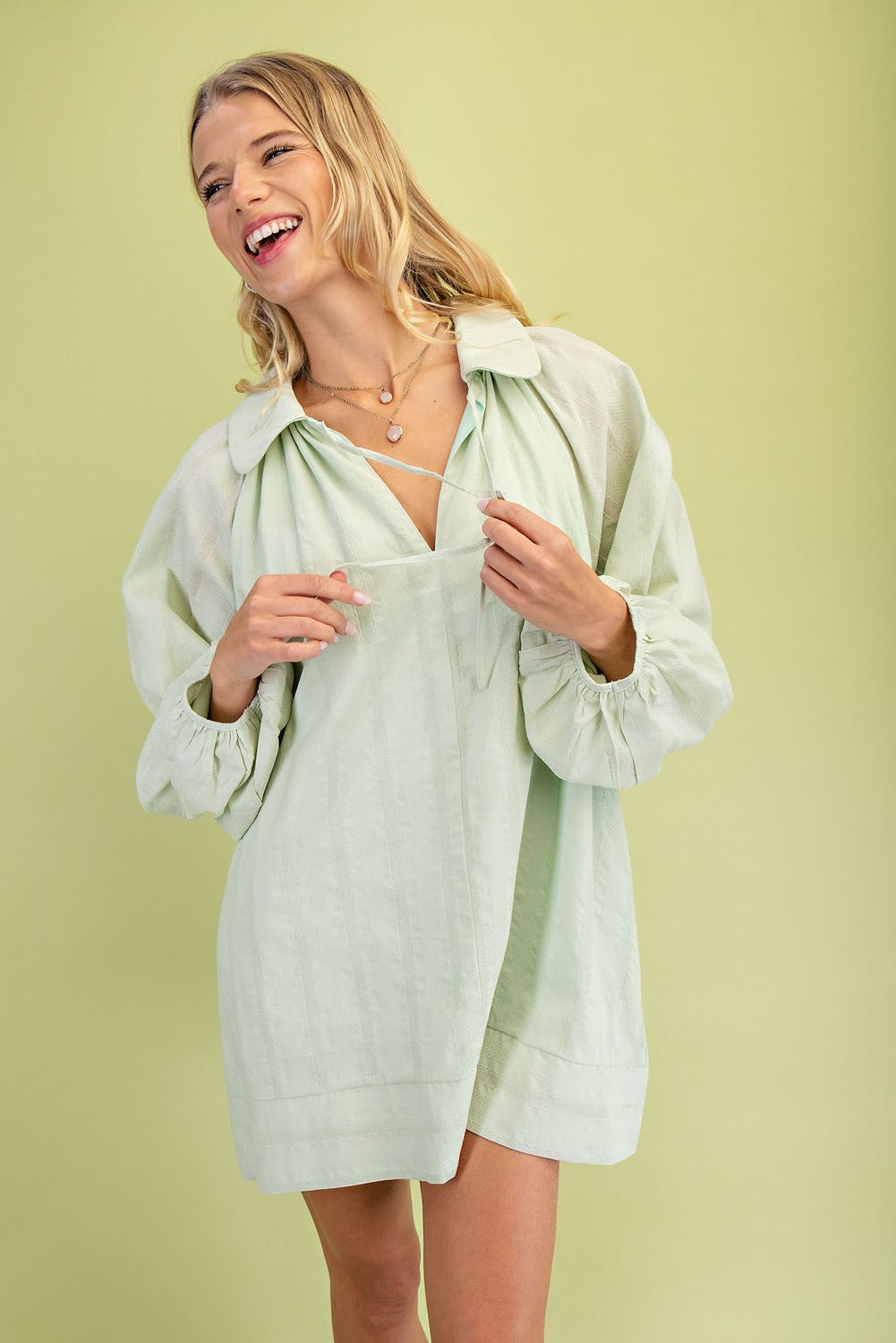 This playful mini dress boasts a textured, artisan feel with its balloon sleeves and front tie detail. The breathable fabric blend of cotton and rayon adds to its effortless style. Perfect for any height, as seen on our 5'9" and 5'10" models. Embrace your unique fashion sense with this must-have piece!