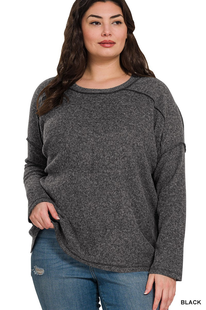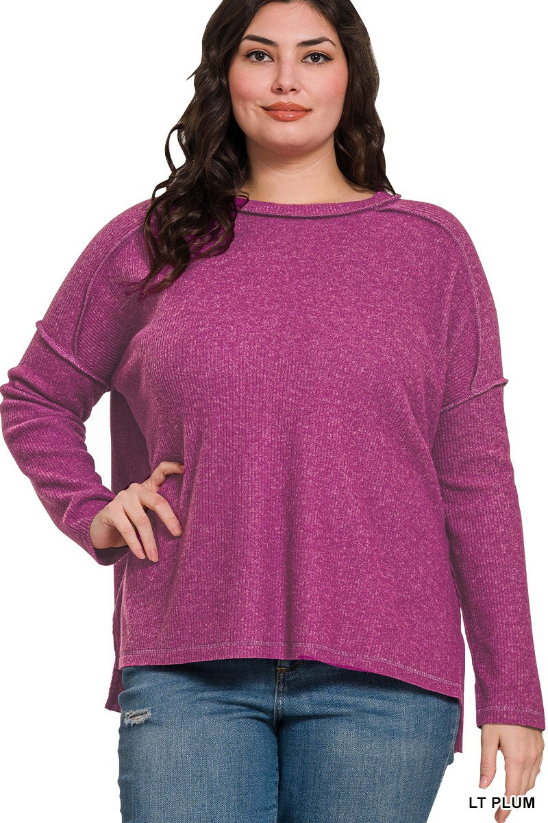 Get cozy in our PLUS BRUSHED RIBBED HACCI HI-LOW SWEATER. With its drop shoulder, exposed seam, and side slits, this sweater offers both comfort and style. Perfect for any casual occasion, it's a must-have for your wardrobe.