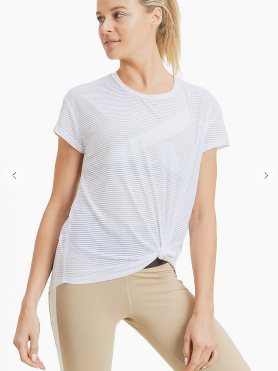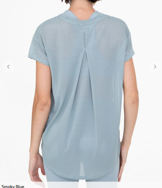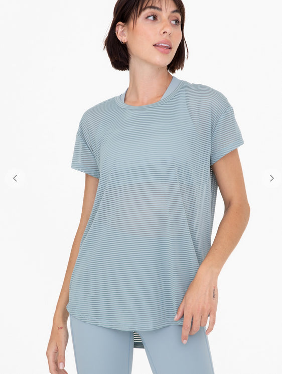 Run in style and comfort with the Sheer Striped Mesh Paneled Back Tee! This athletic tee features a sheer striped mesh panel on the back for sleek ventilation and a stylish look like no other. So don't be caught running around with a subpar outfit – grab this tee and make a statement!